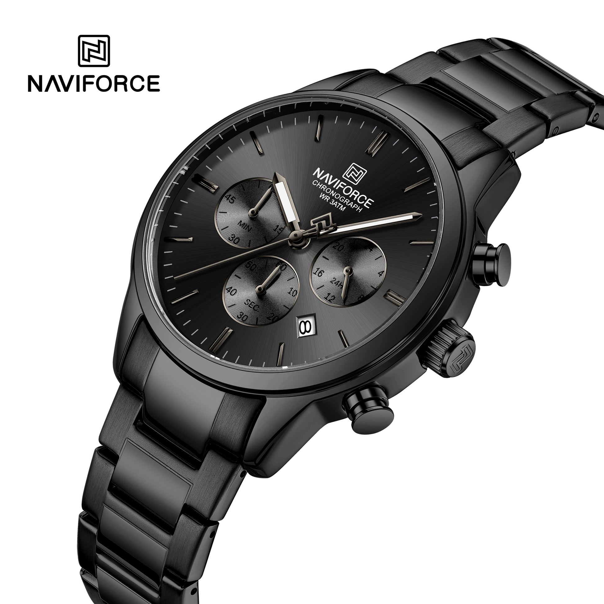 The Naviforce 8076 Ambiance Men Watch is a harmonious blend of sophisticated artistry and functionality, featuring a lustrous black rosegold chain that entwines elegantly around the wrist, complemented by a striking black dial. The chronograph intricately echoes the rhythm of time, while its 3ATM water resistance ensures resilience against the elements, offering both style and practicality. A window date display further enhances its utility, making it an impeccable choice for the discerning gentleman.