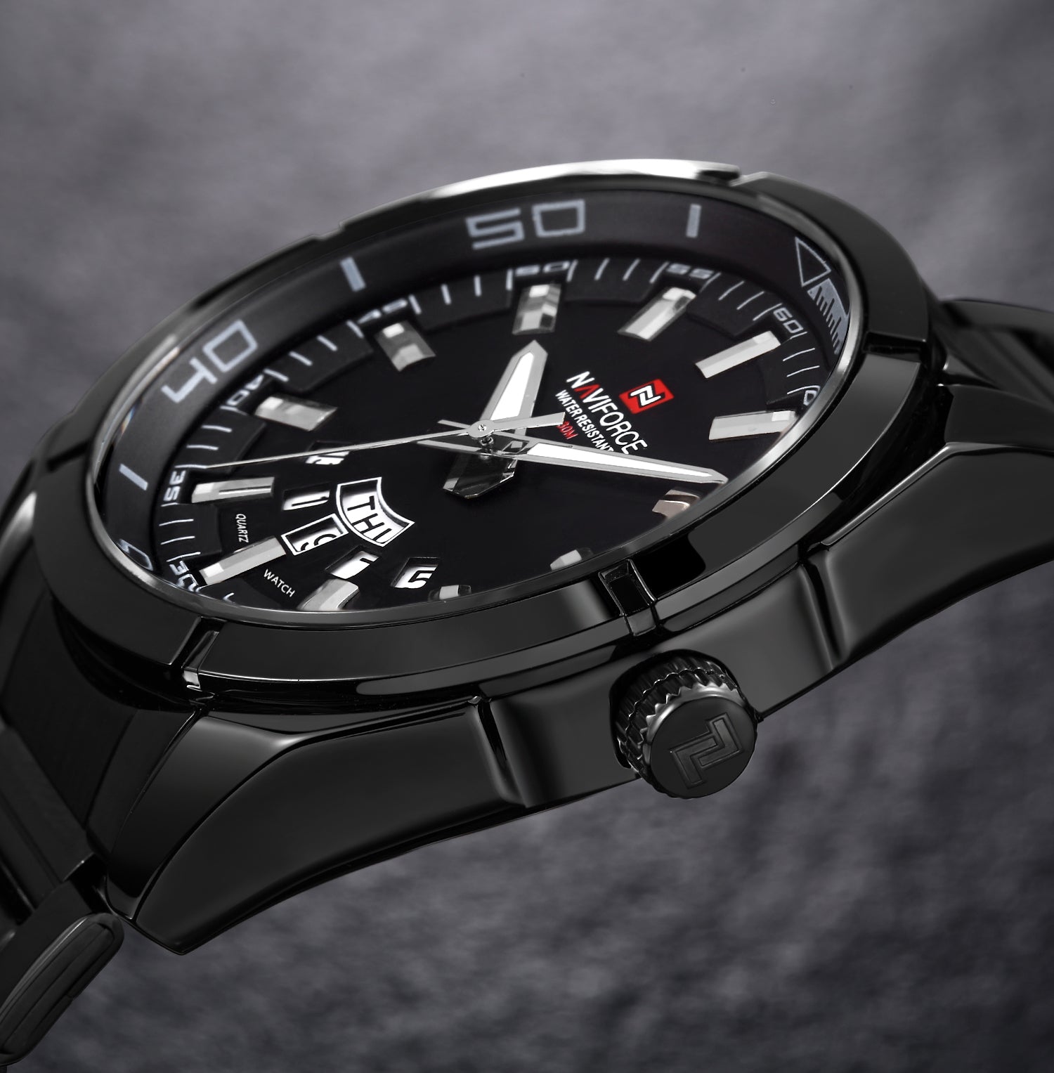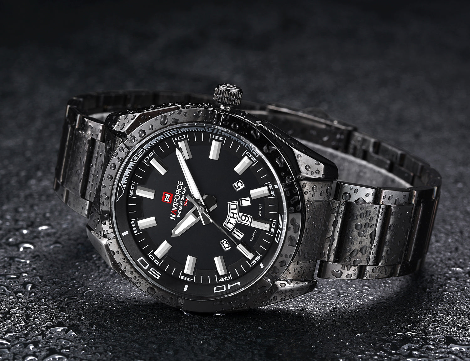 Introducing the Naviforce NF9038 Sterling Men Watch in sleek black. This premium timepiece boasts a durable stainless steel strap and 3ATM water-resistant technology. Featuring a window for the date and date functionality, elevate your style with this luxurious and sophisticated watch.